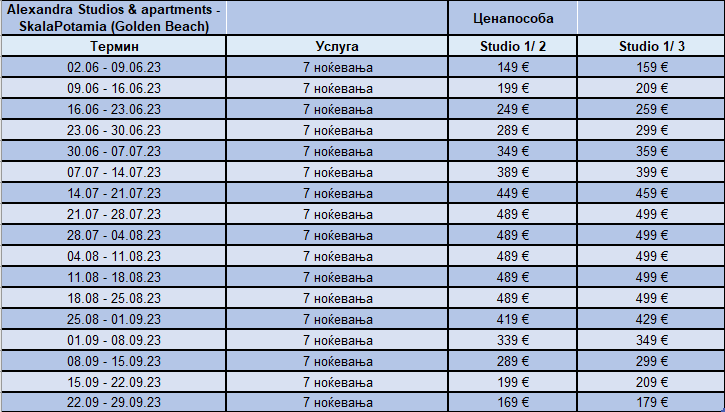 - -Цените се однесуваат на наем на студио за 7 ноќевања (без превоз).
