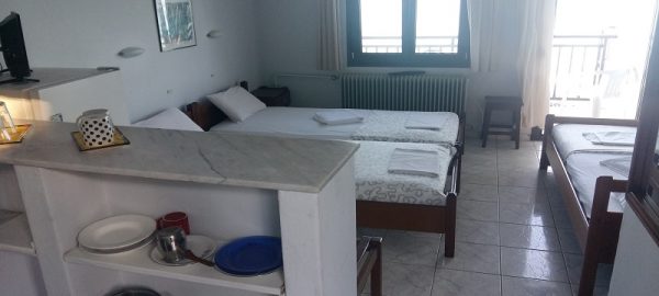 Студиото располага со три поединечни кревети, мини кујна со садови, решо, голем фрижидер, тв,клима уред, мало и тесно вц со туш. Има можност за дополнително креветче за дете до 03 години. Има директен поглед на море.