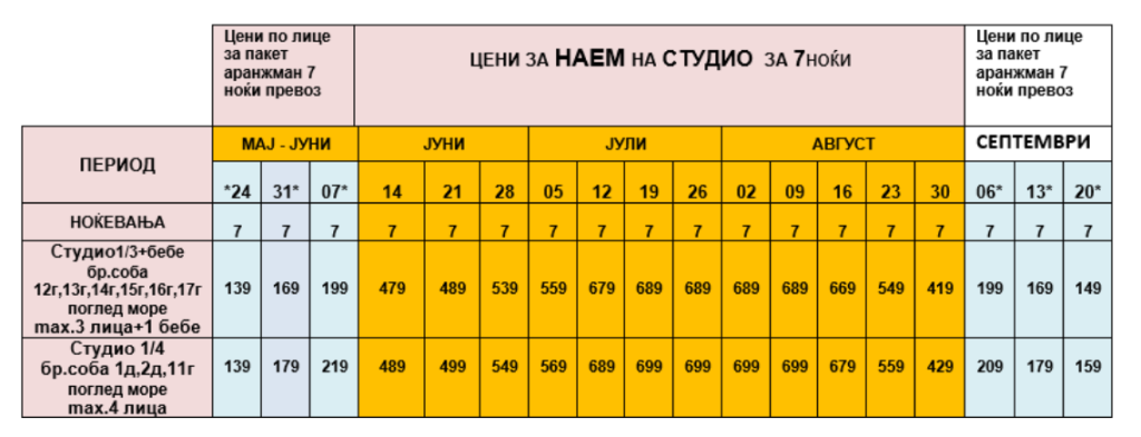 ОЗНАЧЕНИ СО ЗВЕЗДИЧКА * ВО ТАБЕЛАТА СЕ ПАКЕТ АРАНЖМАНИ И СЕ ДАДЕНИ ПО ЛИЦЕ ЗА 7 НОЌИ СО ВКЛУЧЕН АВТОБУСКИ ПРЕВОЗ
