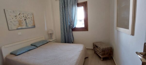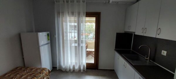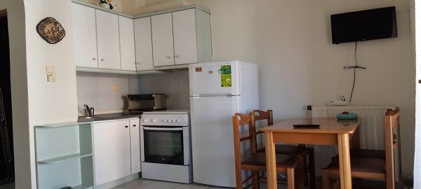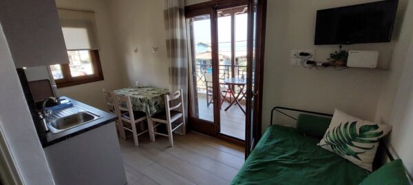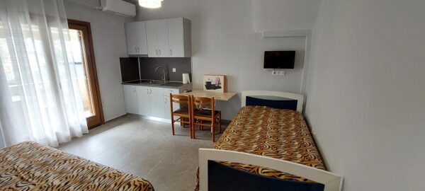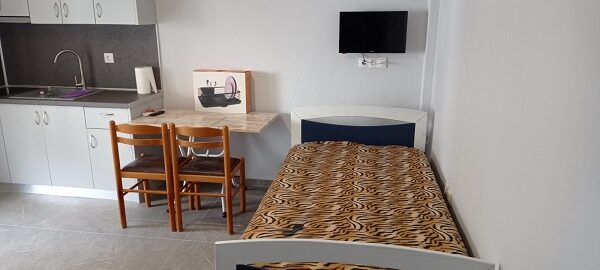 Во кујната има еден кревет поединечен + еден поединечен кревет од кој се извлекува уште еден кревет на висина како поединечниот .Кујната е опремена со вградена плотна со две рингли,голем фрижидер и комплетен кујнски инвентар.Во кујната има Тв и маса за ручавање.Спалната соба има еден дупол кревет (француски).Апартманот има плакар за алишта и клима уред.Има сопствено купатило и WC.Излегува на тераса со страничен поглед на море.
