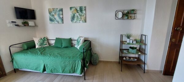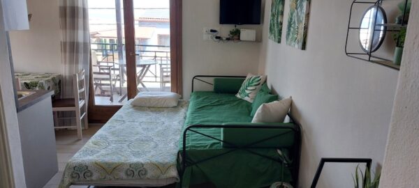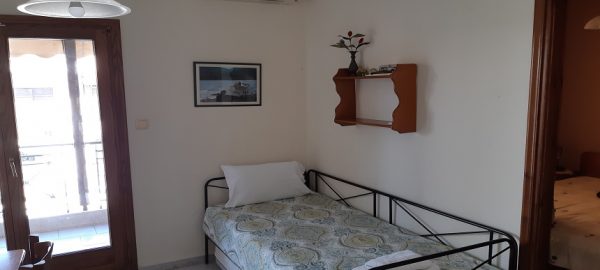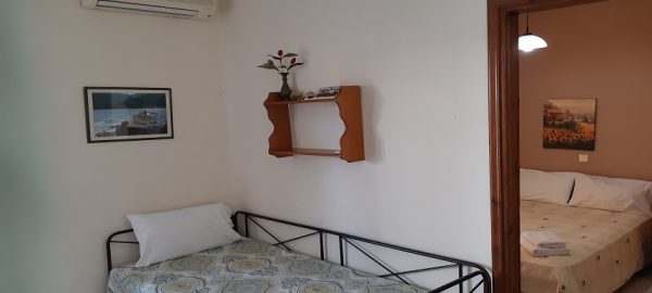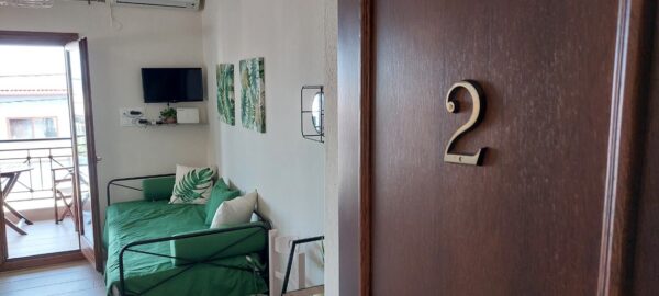 се наоѓа на први кат.Во кујната има еден поединечен стандарден кревет и еден кревет на извлекување под поединечниот.Кујната е опремена со вградена плотна со две рингли,голем фрижидер и комлетен кујнски инвентар.Во кујната има маса за ручавање, ТВ и клима уред.Спалната соба е со дупол кревет (француски),плакар за алишта.Има сопствено купатило и ВЦ. Апартманот излегува на тераса со директен поглед на море.