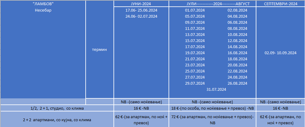 –  Цените се дадени по лице, по ноќевање без вклучен превоз; или за апартман + доплата за превоз