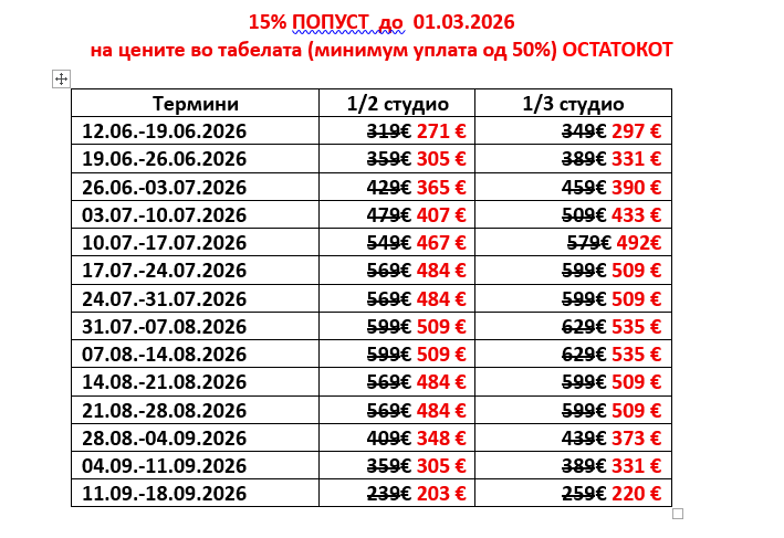 -ЦЕНИТЕ во табелата се дадени за наем на студио или апартман за 7 ноќевања.