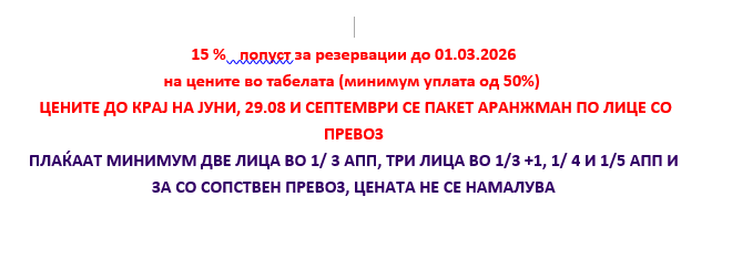 ПЛАЌААТ МИНИМУМ ДВЕ ЛИЦА ВО 1/ 3 АПП, ТРИ ЛИЦА ВО 1/3 +1, 1/ 4 И 1/5 АПП И ЗА СО СОПСТВЕН ПРЕВОЗ, ЦЕНАТА НЕ СЕ НАМАЛУВА