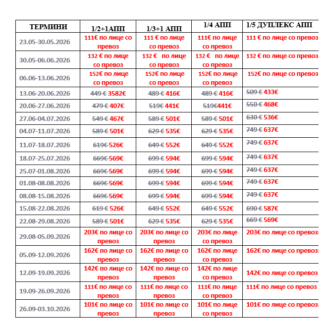 Дадените цени во табелата се по лице со вклучен превоз до 13 јуни и септември, а цените во јули и август се за наем на апартман