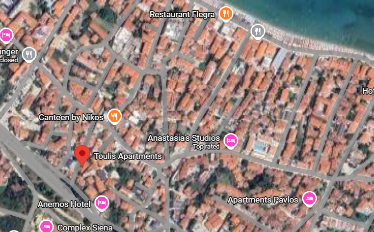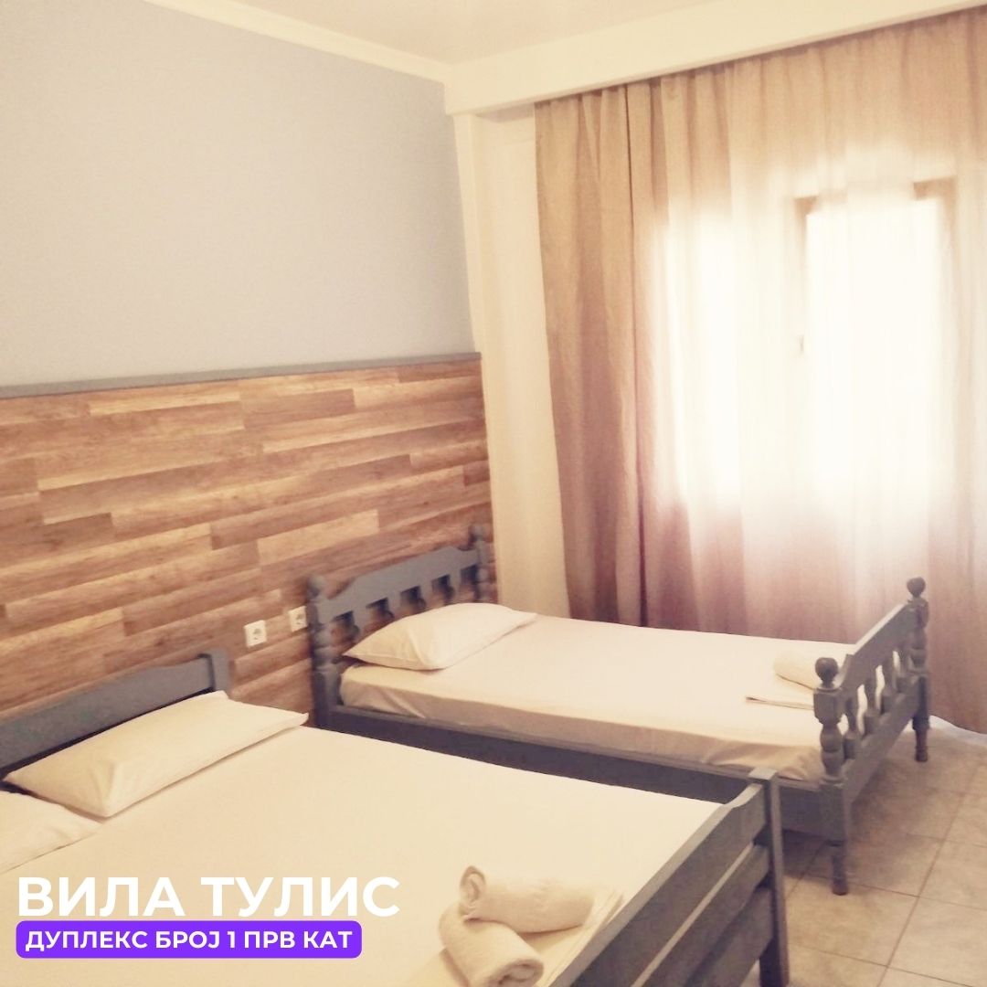 Вила Тулис (целосно реновирана) се наоѓа на 300 метри од плажа во самиот центар на Полихроно, веднаш над црквата. Вилата располага со апартмани за три, четири и дуплекс апартмани за пет лица, комплетно опремени со кујна, тоалет и тераса. За секој апартман има обезбедено приватен бесплатен паркинг, заеднички двор за дружење на гостите, иралиште за кошарка и приватна теретана. Одличен избор за семејства. Сите апартмани се опремени со клима уред чие користење се доплаќа 35 евра за 7 ноќевања на лице место кај газдите на вилата.