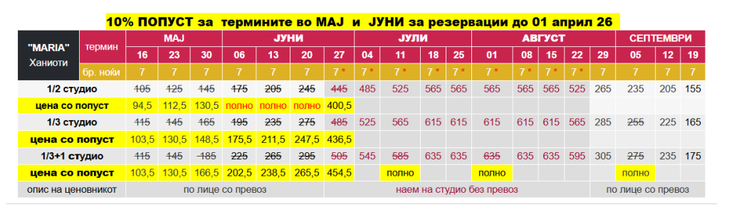 – Цените за 7 ноќи/8 дена со *, се дадени за наем на цело студио без вклучен превоз;