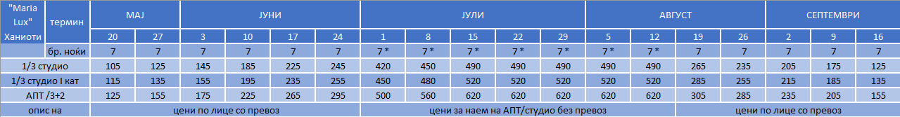 – Цените за 7 ноќи/8 дена (со *), се дадени за наем на цело студио без вклучен превоз;