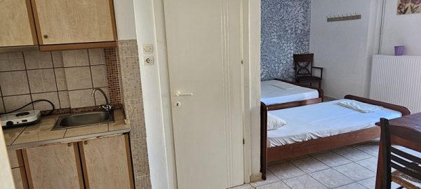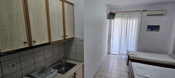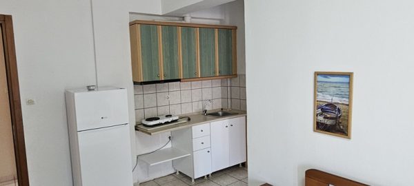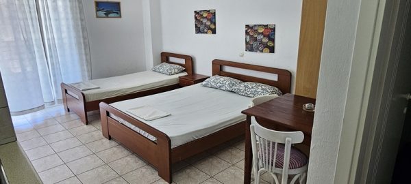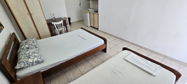 Студиото располага со еден дупол и два поединечни кревети.Во сколопот на собата е кујната која е комплетно опремена со кујнски инвентар.Има решо со две рингли,аспиратор и фрижидер голем.Излегува на комотна тераса со маса и столици .Студиото има клима уред,тв и стандардно купатило со вц.