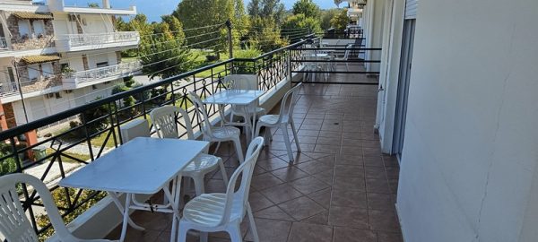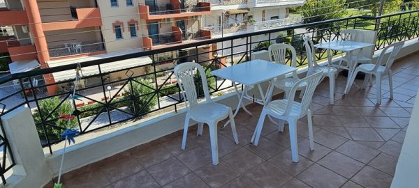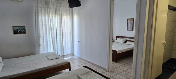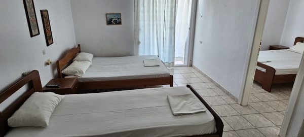 Апартманот располага со две спални соби меѓусебно одвоени со врата.Во едната спална соба има еден дупол кревет еден поединечен кревет клима уред,тв + кујна комплетно опремена со кујнски инвентар,електрично решо,голем фрижидер.Во другата спална соба има дупол кревет ,плакар за алишта.И од едната и од другата спална соба се излегува на тераса со маса и столици. Апртманот има стандардно купатило и вц.
