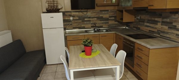 Апартманот располага со две спални соби + кујна комплетно опремена со кујнски инвентар .Во едната спална соба има дупол кревет и поединечен кревет плакар за алишта,тв,клима и излегува на тераса со маса и столици.Втората спална соба има еден дупол кревет и еден поединечен кревет ,плакар за алишта и излегува на истата тераса со маса и столици. Апртманот има стандардно купатило и вц.