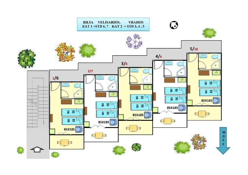 - Двокреветни студија – бр.3, 4, 5, 6 7 со две единечни легла + едно легло на расклопување (фотелја), погодни за 2 возрасни + 1 дете до 12 години
