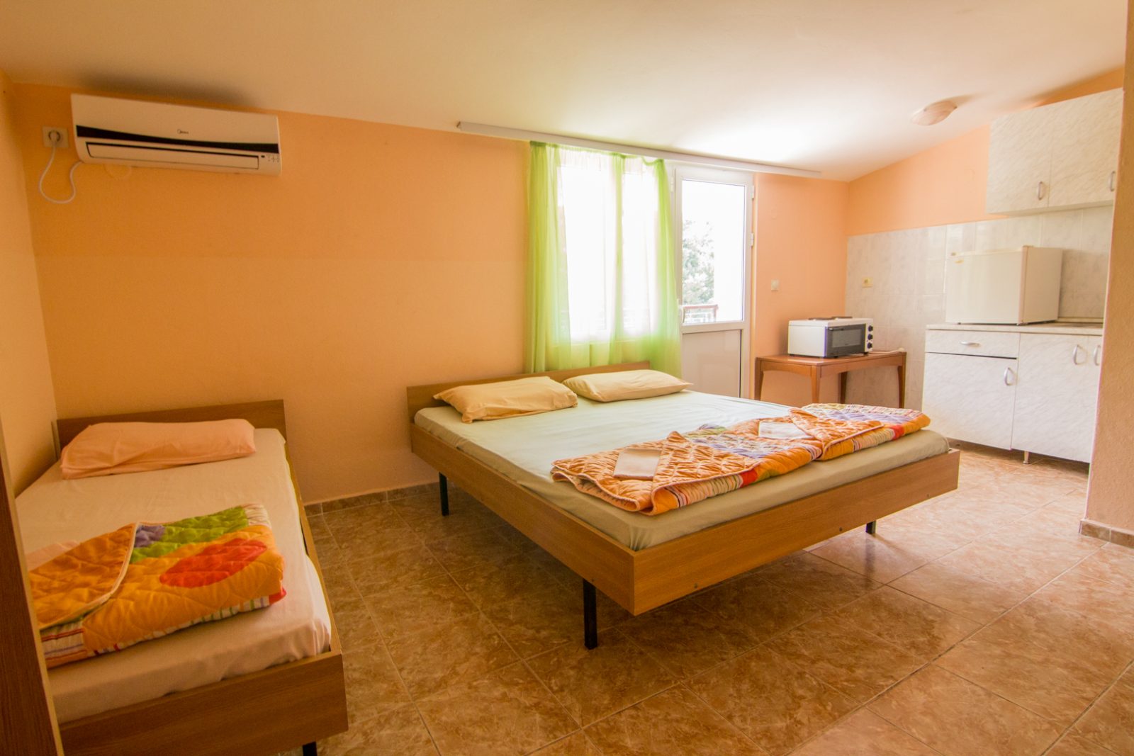 ВИЛА БОГОЕВИЌ располага со двокреветни, трокреветни и четворокреветни соби. Собите на првиот и вториот кат се со заедничко купатило, односно на две соби има еден тоалет. Овие соби немаат клима и фрижидер ( колона 1 од табелата ). На третиот кат дел од собите имаат сопствено купатило, клима и фрижидер ( колона 2 од табелата). Kористење на клима уредот е вклучен во цената.