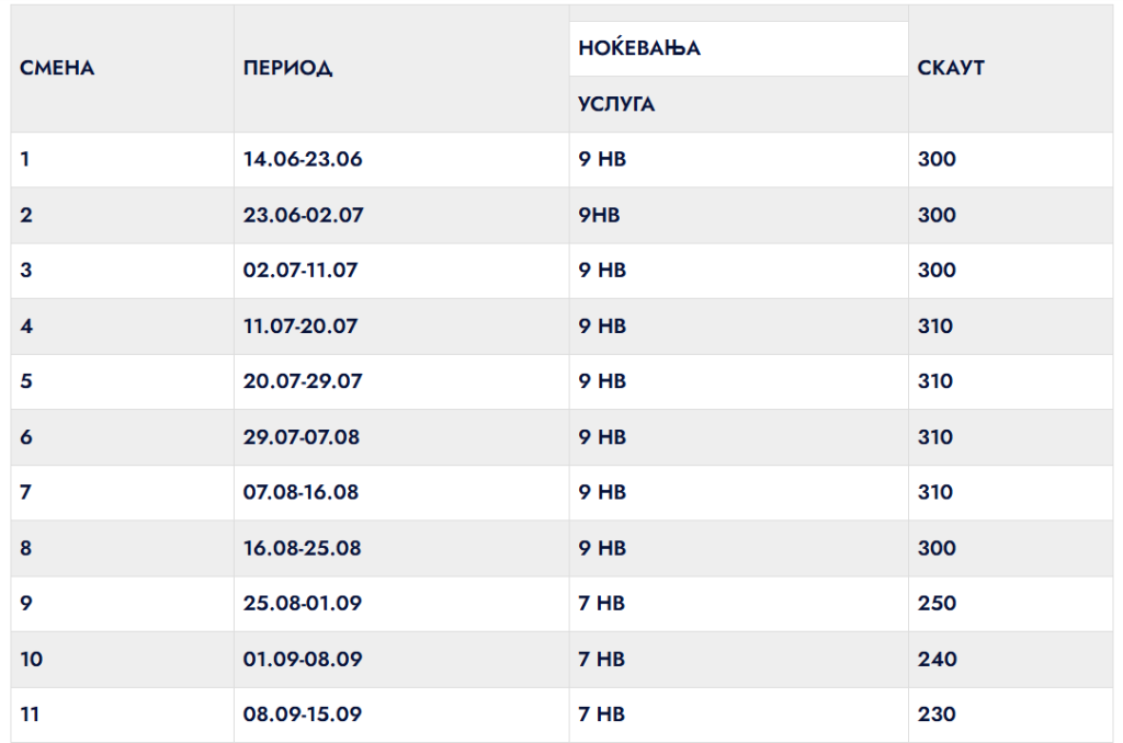 * Цените се изразени во евра и се однесуваат на ПАКЕТ АРАНЖМАН ПО ЛИЦЕ 9 или 7 ноќевања со појадок и вечера со вклучен превоз – Прво дете до 12 год. ПОПУСТ од 50 % од цената на аранжманот – Второ дете до 12 год. ГРАТИС (доплата за превоз 45 евра) за сместување во 1/3 соба – Второ дете до 12 год. ПОПУСТ од 50% од цената на аранжманот за сместување во 1/4 соба -Попуст за трето возрасно лице или дете над 12год – 20% попуст – Дете до 5 год. кое не користи кревет – ГРАТИС (доплата за превоз 25 евра ) -доплата за еднокреветна соба 70% *Попустот за деца важи за сместување со две возрасни лица.