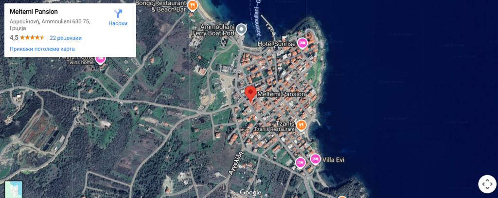Вилата “МЕЛТЕМИ“лоцирана е во центарот на градот Амулиани над супермаркетот Продос.Убаво опремена вила. Секоја соба има кујна комплетно опремена со кујнски инвентар, мал фрижидер со комора и плотна со 2 рингли има клима уред и тв и тераса со маса и столици.Секоја соба има стандардно купатило и вц. Вилата има и безжичен интернет паркинг јавен кој функционира на принципот прво слободно место.