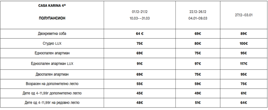 Хотелот Casa Karina 4* се наоѓа на само 100 m од главната станица на гондола-лифтот во Банско. Во сите сезони од годината, Casa Karina 4* на своите гости им обезбедува мир и удобност, професионална услуга, вкусна храна и широк спектар на дополнителни услуги.
