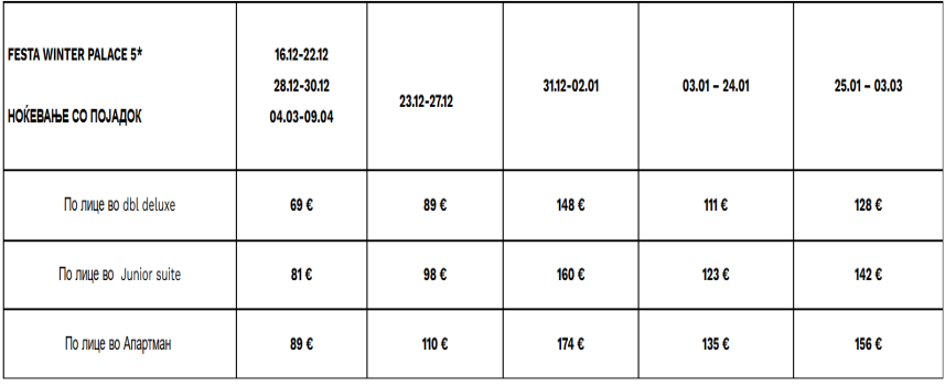 Во цените не е вклучено : патничко осигурување и туристичка тaкса 1€ по лице на ден