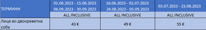 Цените се во евра по лице за 1 ноќевање на база ALL INCLUSIVE и вклучуваат :